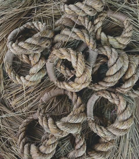 神話において、天照大神からの賜り物である稲穂のしめ縄で。